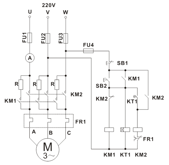 2、時(shí)間繼電器控制串電阻降壓起動(dòng)控制線路:
