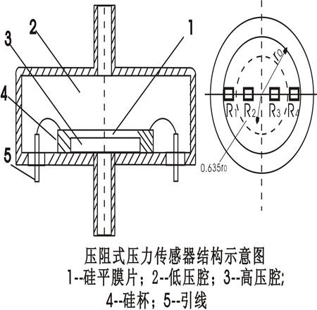 硅平膜片上的擴散電阻通常構(gòu)成橋式測量電路,相對的橋臂電阻是對稱布置的,電阻變化時,電橋輸出電壓與膜片所受壓力成對應(yīng)關(guān)系。上圖所示為一種壓阻式壓力傳感器的結(jié)構(gòu)示意圖,硅平膜片在圓形硅杯的底部,硅杯的內(nèi)外兩側(cè)輸入被測壓力及參考壓力,本套裝置的傳感器參考壓力為當(dāng)?shù)卮髿鈮毫。壓力差使膜片變形,膜片上的兩對電阻阻值發(fā)生變化,使電橋輸出相應(yīng)壓力變化的信號。為了補償溫度效應(yīng)的影響,一般還可在膜片上沿對壓力不敏感的晶向生成一個電阻,這個電阻只感受溫度變化,可接入橋路作為溫度補償電阻,以提高測量精度。