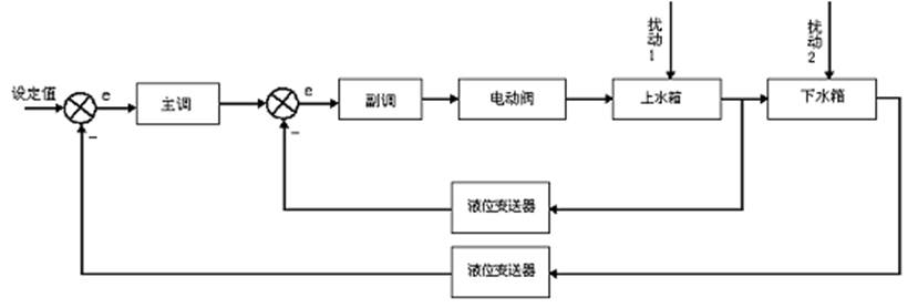 本實(shí)驗(yàn)采用儀表控制,將上水箱液位控制在設(shè)定高度。串級回路是由內(nèi)反饋組成的雙環(huán)控制系統(tǒng),屬于復(fù)雜控制范疇。根據(jù)下水箱的液位信號輸出給儀表,作為主調(diào)節(jié)器輸入,主調(diào)節(jié)器的輸出作為副調(diào)節(jié)器的輸入,在串級控制系統(tǒng)中,兩個調(diào)節(jié)器任務(wù)不同,因此要選擇調(diào)節(jié)器的不同調(diào)節(jié)規(guī)律進(jìn)行控制,副調(diào)節(jié)器主要任務(wù)是快速動作,迅速抵制進(jìn)入副回路的擾動,至于副回路的調(diào)節(jié)不要求一定是無靜差。主調(diào)節(jié)器的任務(wù)是準(zhǔn)確保持下水箱液位在設(shè)定值,因此,主調(diào)節(jié)器采用PI調(diào)節(jié)器也可考慮采用PID調(diào)節(jié)器。上下水箱雙容串級控制方塊原理圖如下: