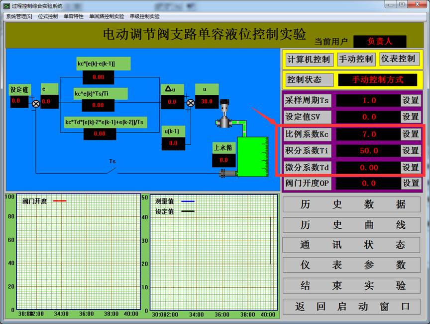 本實(shí)驗(yàn)采用儀表控制,將液位控制在設(shè)定高度。根據(jù)上水箱液位信號LT1輸出給儀表,智能儀表根據(jù)P、I、D參數(shù)進(jìn)行PID運(yùn)算,輸出信號給電動(dòng)調(diào)節(jié)閥,然后由電動(dòng)閥控制水泵1供水系統(tǒng)的進(jìn)水流量,從而達(dá)到控制設(shè)定液位基本恒定的目的。