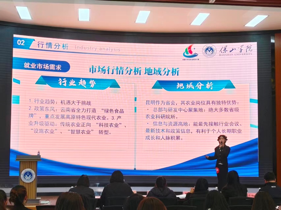 比賽現(xiàn)場,選手們通過行業(yè)趨勢研判、地域發(fā)展分析、個人成長路徑設計等多個環(huán)節(jié),全面呈現(xiàn)了個人對未來職業(yè)的深入思考與系統(tǒng)規(guī)劃。經濟管理學院劉悅以“扎根云嶺聲動四方”為題,勾勒出滇西青年的文化遠征職業(yè)藍圖,立志將地方特色文化傳播遠方;馬惟萌聚焦鄉(xiāng)村教育發(fā)展,以“扎根鄉(xiāng)土,編織未來”為目標,立志成為鄉(xiāng)村兒童計算思維啟蒙導師,用知識助力鄉(xiāng)村孩子成長。大數(shù)據學院饒文菊瞄準科技前沿,以AI應用前端架構師為職業(yè)方向,展現(xiàn)了當代大學生在科技領域的探索精神與規(guī)劃視野。藝術設計與珠寶學院的蔣發(fā)廳立足專業(yè)所長,以“執(zhí)設計之筆,繪振興藍圖”為核心,構建了園林景觀設計師助力鄉(xiāng)村振興的成長路徑。教育學院的白勝、劉真等選手懷揣教育初心,分別以小學數(shù)學教師、中學數(shù)學教師為職業(yè)追求,分享了投身教育事業(yè)、護航學生成長的堅定愿景。此外,還有選手圍繞網絡文學主理人、高原特色現(xiàn)代農業(yè)等多個熱門及特色職業(yè)方向,進行了專業(yè)的行業(yè)分析與清晰的職業(yè)規(guī)劃闡述,充分展現(xiàn)了選手們多元的職業(yè)追求與扎實的專業(yè)素養(yǎng)。