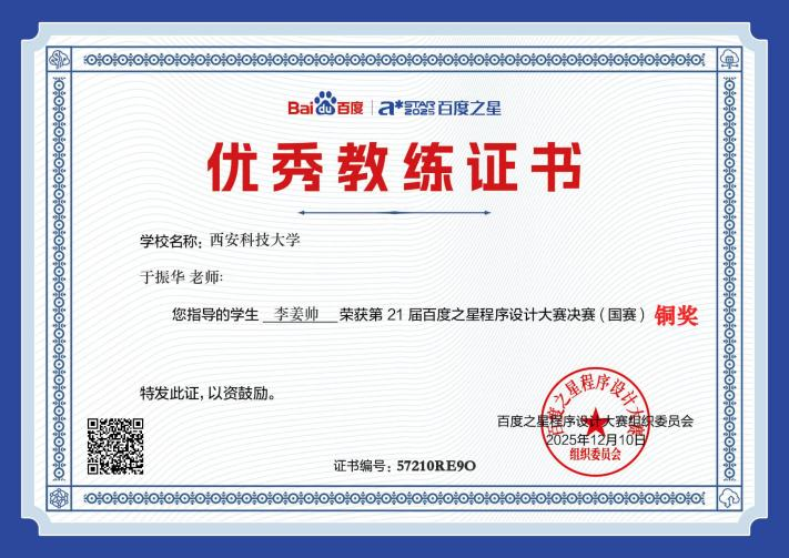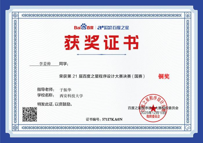 決賽當(dāng)天,李姜帥同學(xué)沉著冷靜、從容應(yīng)戰(zhàn),面對復(fù)雜的競賽題目,迅速理清解題思路,高效完成程序編寫與調(diào)試。憑借清晰的邏輯架構(gòu)、規(guī)范的代碼實(shí)現(xiàn)與合理的時(shí)間分配,最終成功躋身銅獎(jiǎng)行列,實(shí)現(xiàn)了西安科技大學(xué)在百度之星程序設(shè)計(jì)大賽中的歷史性突破,也是學(xué)校“以賽促學(xué)、以賽促練” 人才培養(yǎng)模式的生動(dòng)實(shí)踐。