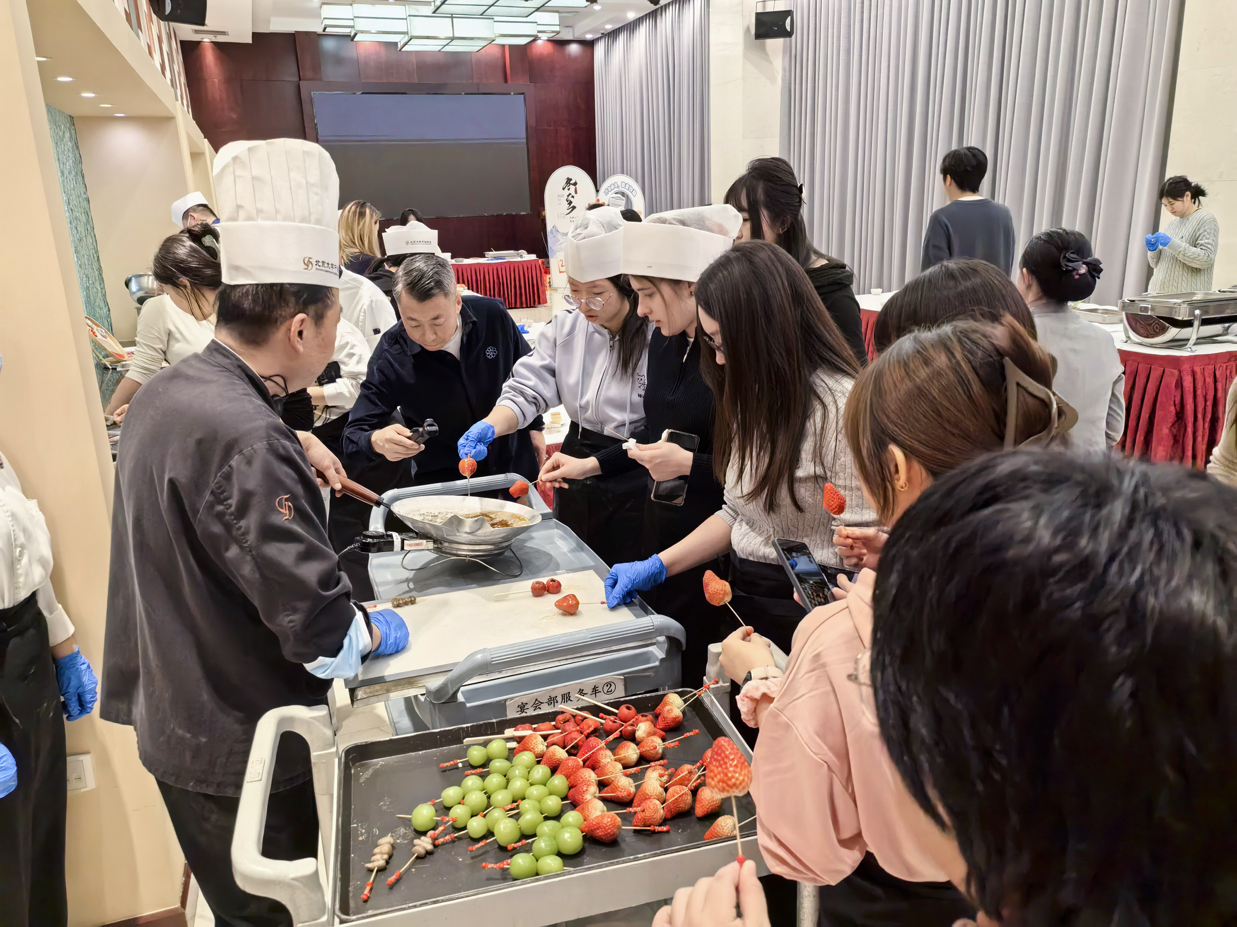 在等待餃子煮制的間隙,冰糖葫蘆制作環(huán)節(jié)趣味登場。工作人員早已備好洗凈的山楂、各式鮮果與清亮的糖漿,現(xiàn)場指導(dǎo)同學(xué)們巧妙串果、均勻掛糖。隨著糖漿遇冷凝結(jié),裹上一層晶瑩透亮的“琉璃外衣”,一串串冰糖葫蘆陸續(xù)完成。大家品嘗著自己親手制作的甜蜜成果,每個人臉上都洋溢著滿足的笑容。