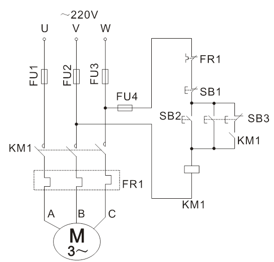 按圖5-6接線。圖中SB1、KM1、FU1、FU2、FU3、FU4為掛件GDQ39-1上的器件,電機(jī)選用DQ10(△/220V)。接線時(shí),先接主電路,它是從220V三相交流電源的輸出端U、V、W開(kāi)始,經(jīng)熔斷器FU1、FU2、FU3、接觸器KM1主觸點(diǎn)到電動(dòng)機(jī)M的三個(gè)線端A、B、C的電路,用導(dǎo)線按順序串聯(lián)起來(lái),有三路。主電路經(jīng)檢查無(wú)誤后,再接控制線路,從熔斷器FU4插孔W開(kāi)始,經(jīng)按鈕SB1常開(kāi)、接觸器KM1線圈到插孔V。線路接好經(jīng)指導(dǎo)老師檢查無(wú)誤后,按下面步驟進(jìn)行實(shí)訓(xùn):
